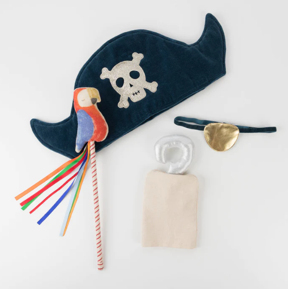 Este disfraz de pirata es perfecto para una fiesta pirata o un juego imaginativo en cualquier día. Cuenta con un sensacional gorro de algodón, un parche brillante en el ojo y un gancho, todo con relleno de poliéster para un efecto fabuloso. ¡Combina esto con la varita rematada con un loro colorido, y te verás como un verdadero personaje de capa y espada!