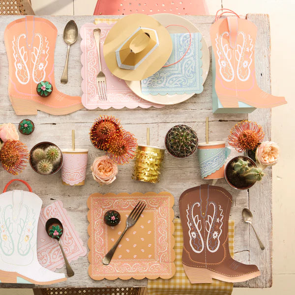 ¡Sí, es hora de una fiesta occidental! Este tema evoca un ambiente aventurero, con muchas oportunidades para el encanto rústico, la comida abundante y el baile. Un tema divertido para celebrar una fiesta de cumpleaños para todas las edades, un evento de música country o una barbacoa. Da vida al espíritu de la frontera con estos brillantes platos de papel para botas, el diseño realista y la mezcla de colores añadirán una decoración lúdica a tu mesa de fiesta o buffet.